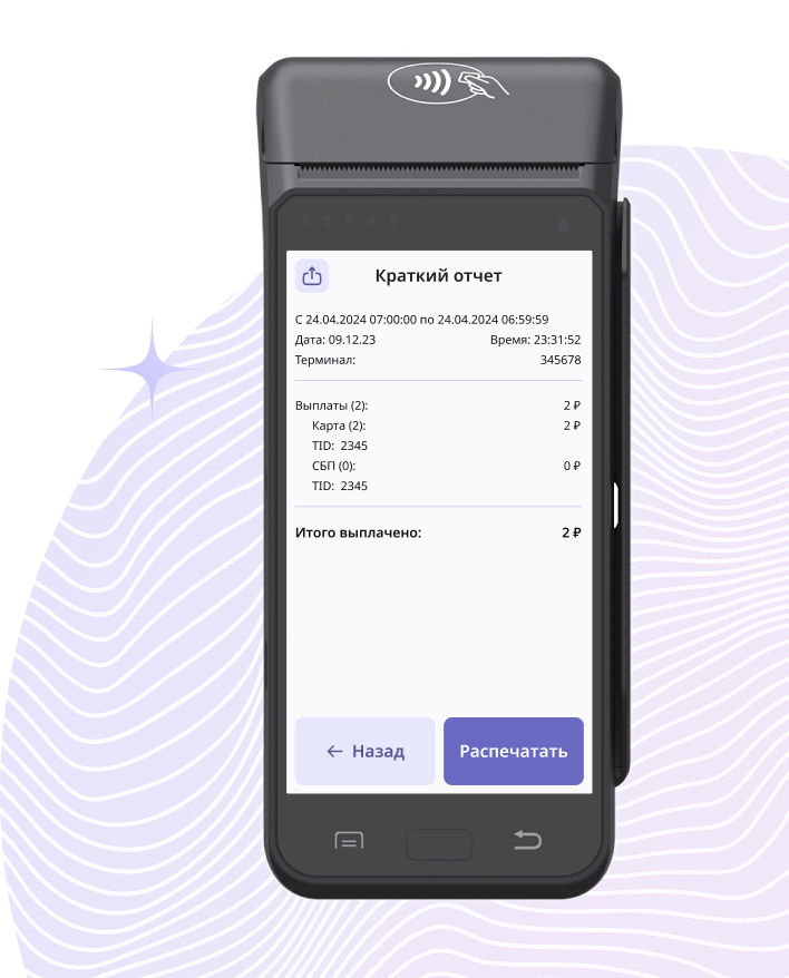 Отчёт по выплатамДоступен отчёт по выплатам за день. Его можно просмотреть на POS-терминале, распечатать или отправить на email