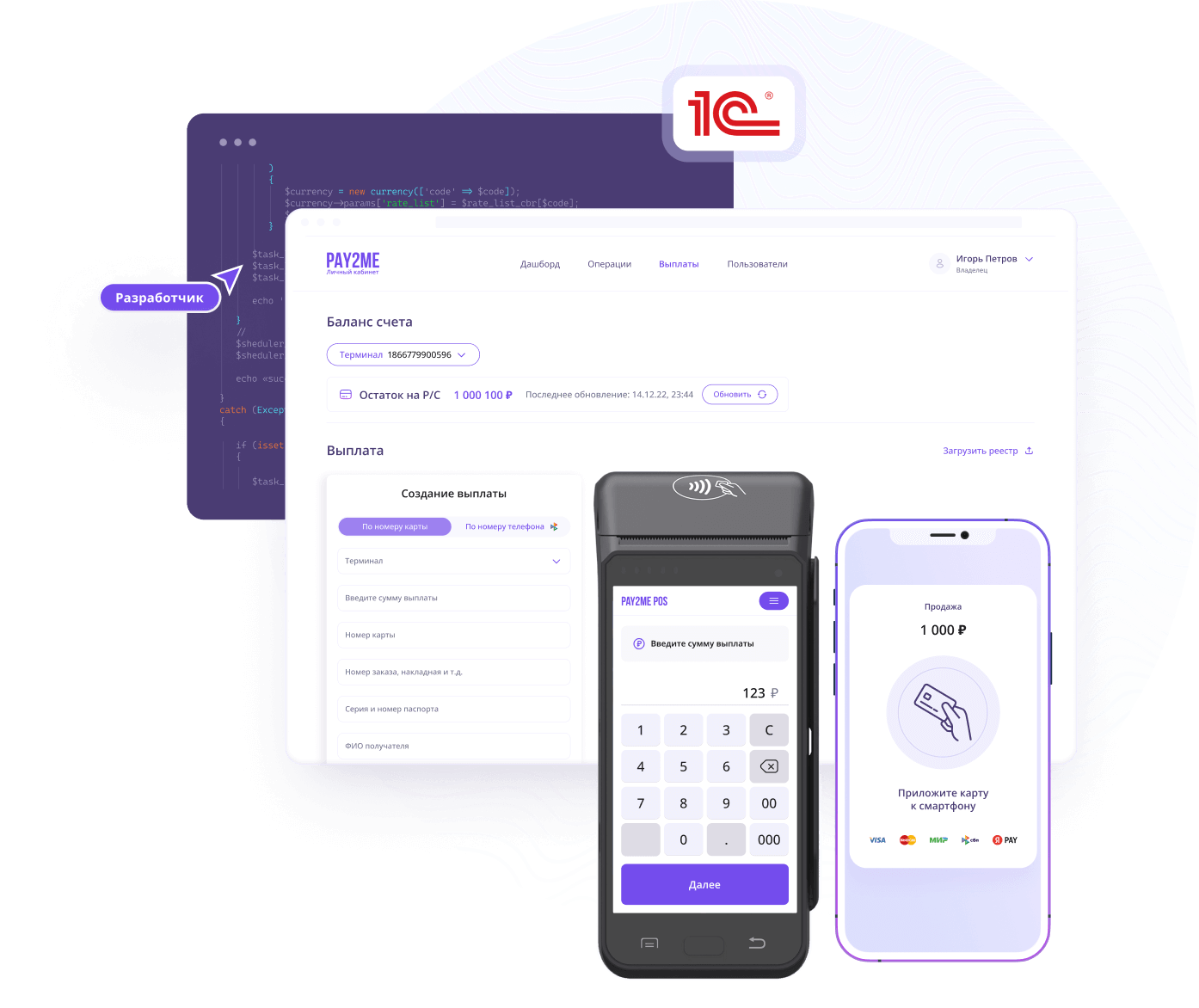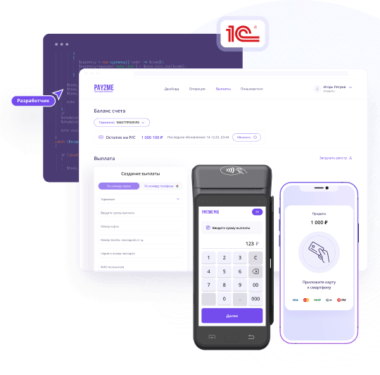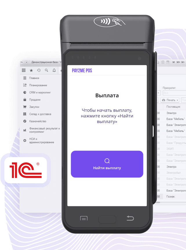 - Кассир создает выплату в 1С, выплата автоматически попадает на POS-терминал